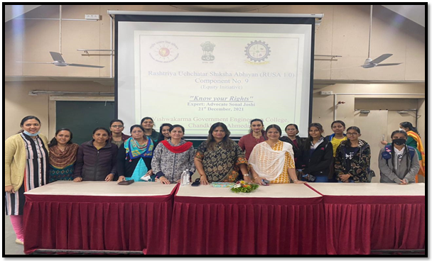 Women Development Cell in association with RUSA Cell organized an Awareness Program on "Know your Rights" for students and faculty members of VGEC on 21st December 2021, Monday from 11.00 AM to 1.00 PM. The expert for this session was Advocate Sonal Joshi (Lawyer, Social Activist, Writer, and International Motivational Speaker). Around 84 students in offline mode and 267 students in online mode participated in the event.