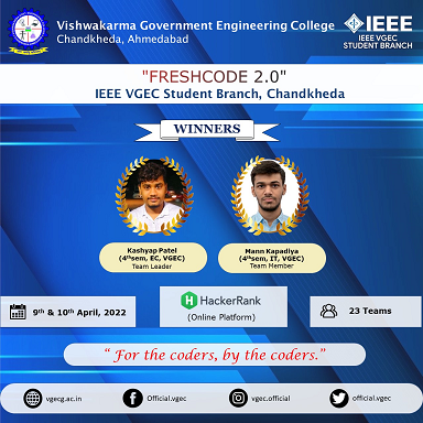 "FRESHCODE 2.0" was a two-day National Level Event conducted by IEEE VGEC SB on 9th and 10th of April on "HACKER RANK". It was conducted in 3 rounds. The event was organised with an objective to provide competitive environment to the participants to hone their coding skills and pave a path for their programming journey.
