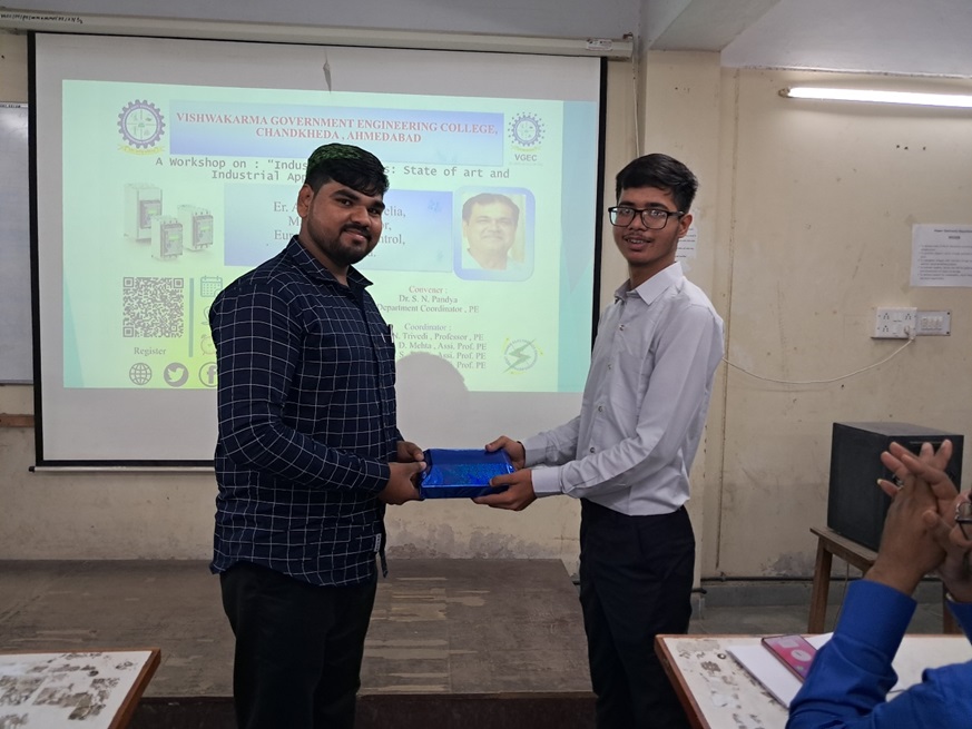 The Power Electronics Engineering Department of Vishwakarma Government Engineering College organized a workshop on “Industrial Drives State of arts and industrial application” with the kind permission of Dr. N. N. Bhpatani Principal, VGEC and Prof. G.K.Shah, Convener VGEC Alumni Association. The talk was attended by 90 students and 10 faculty members who were interested in gaining insights into the latest Development of the field.