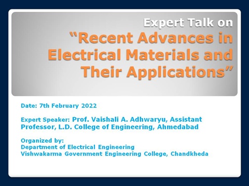 07 February, 2022 Prof. M L Patel Assistant Professor, Electrical Department VGEC ChandkhedaName of Department/Organizer : Electrical Engineering Department, VGEC Chandkheda Date & Time : 7/02/2022 & 3:15 PM-5:15 PM (online mode) No of 6th Sem students : 114 Speaker : Prof. Vaishali A. Adhwaryu, Assistant Professor, L.D. College of Engineering, Ahmedabad Hosted By :