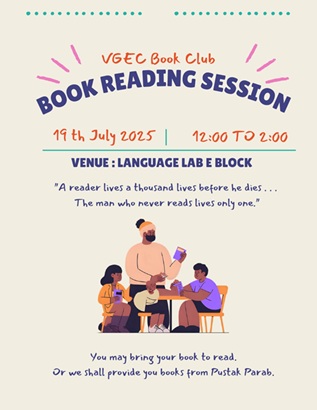 The VGEC Book Club conducted a peaceful and enriching Book Reading Session on 19th July 2025, from 12:00 PM to 2:00 PM, at the Language Lab, E Block. The event was envisioned as a calm literary space where students could take a break from their fast-paced routines and immerse themselves in uninterrupted reading. Without formal speeches or structured activities, the session emphasized self-paced exploration through books.