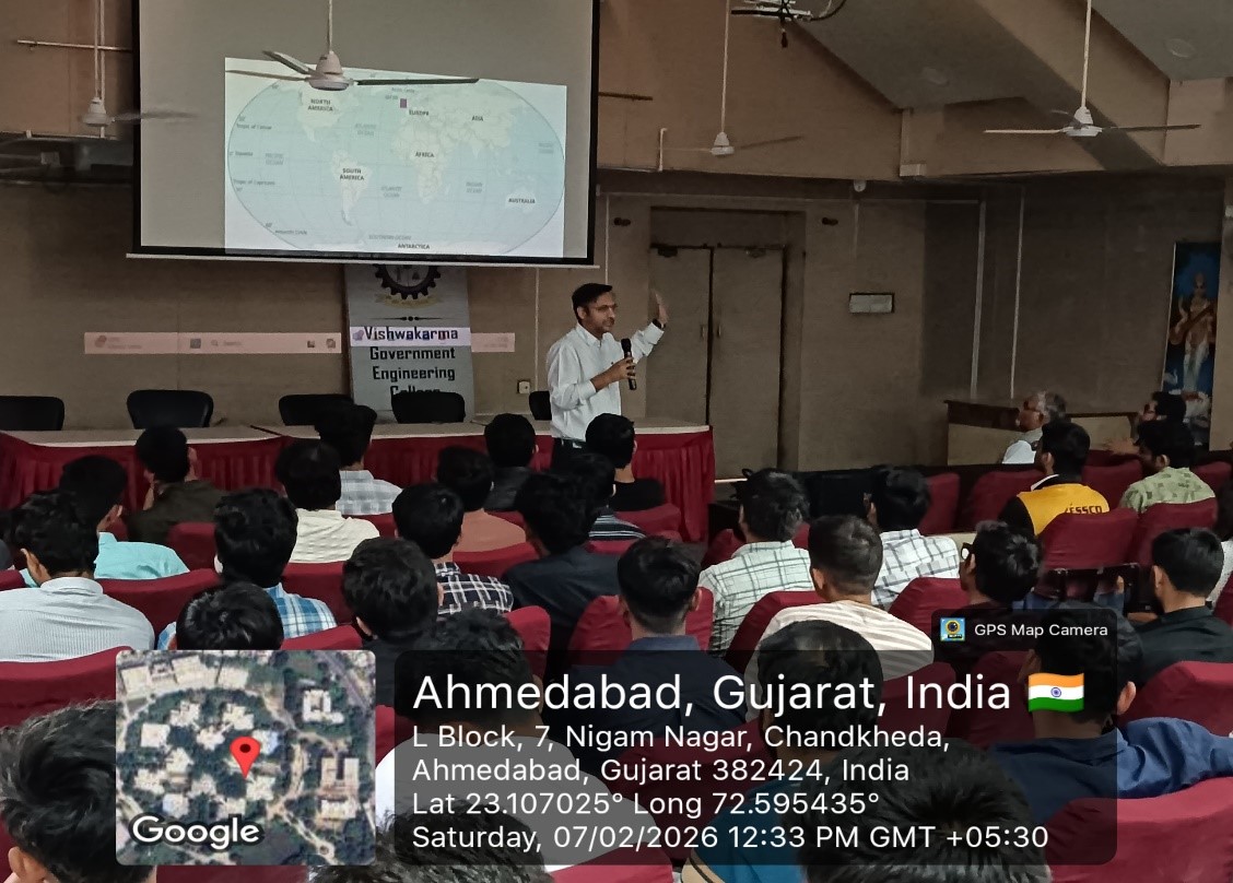 The Electrical Engineering Department of Vishwakarma Government Engineering College (VGEC) organized an expert talk for 8th Semester students on “Engineers of Tomorrow: Shaping India @2047”. The primary objective of this expert lecture was to sensitize final-year electrical engineering students to India’s long-term vision of becoming a developed nation by 2047 and to highlight the critical role young engineers will play in achieving this goal. The session aimed to broaden students’ perspectives beyond academics and placements by emphasizing the importance of professional ethics, social responsibility, innovation, and leadership in engineering practice. Another key objective was to bridge the gap between classroom learning and real-world industry expectations by providing insights into emerging technologies, evolving industrial trends, and the competencies required for future-ready engineers. The lecture also sought to motivate students to adopt a mindset of lifelong learning, research orientation, and entrepreneurship, while encouraging them to align their technical expertise with national priorities such as sustainability, digital transformation, and inclusive growth. Overall, the objective was to inspire students to view engineering not merely as a career, but as a meaningful contribution toward nation-building and societal development