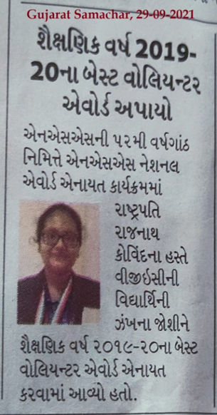 Jhankhna dedicated this award to the entire NSS VGEC team for their cooperation for this great achievement. Principal Prof (Dr) Nilay Bhuptani congratulated Jhankhna Joshi and wished her to continue good work for the betterment of society.