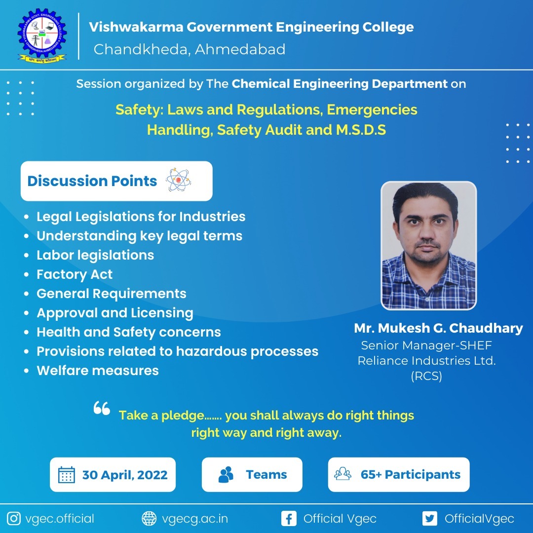 A Training Program on “Chemical Process Safety” (Session – 3) was organized by the Chemical Engineering Department under the banner of the Institution of Engineers (India) (IEI) on April 30,2022 via the online platform of Microsoft Teams.