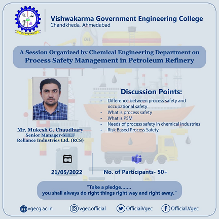 A training Program on “Chemical Process Safety” was organized by the Chemical Engineering Department under the banner of the Institution of Engineers (India) (IEI) on May 21,2022 via the online platform of Microsoft Teams.