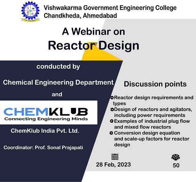 The objective of the webinar on "Reactor Design" is to cover various types of reactors used in chemical processes, including their applications, and to explain the factors that influence reactor design, such as scale-up, conversion, and power requirements. Real-world examples of industrial reactors and agitators will be presented to demonstrate how they are designed and optimized. By the end of the webinar, students should have acquired a strong understanding of reactor design and its practical applications in the chemical industry.