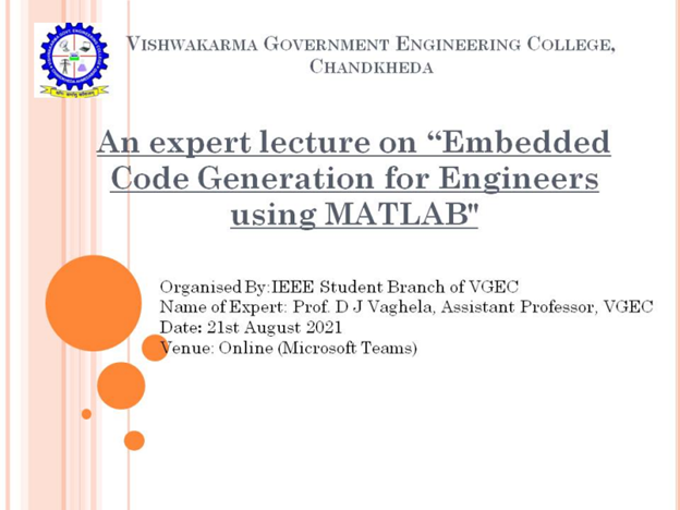 The IEEE Student Branch of Vishwakarma Government Engineering College (VGEC), Chandkheda, successfully organized a National Level One-Day Workshop on "Embedded Code Generation for Engineers using MATLAB" on 21st August 2021. The event was conducted virtually through Microsoft Teams and witnessed enthusiastic participation from students and faculty members across various institutes in India.