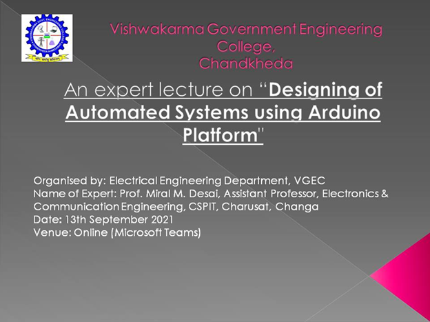 The Electrical Engineering Department successfully conducted an expert talk for 5th-semester students, focusing on Arduino-based automation. Prof. Miral M. Desai delivered an engaging and interactive session that covered the following key topics: