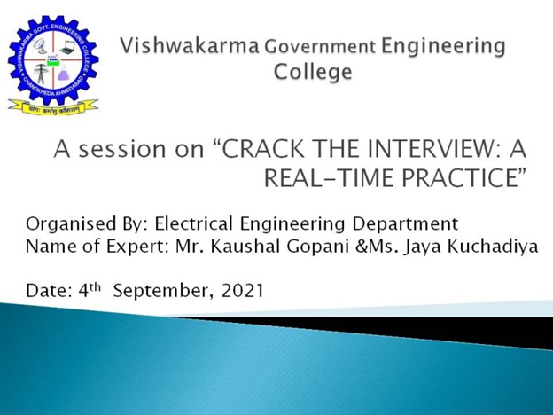 To help students gain confidence and prepare effectively for the recruitment process, the Training and Placement Cell of VGEC organized a Mock Interview Session on 4th September 2021. The session was led by two distinguished professionals from the industry – Mr. Kaushal Gopani from Torrent Power, and Ms. Jaya Kuchadiya from Gujarat State Electricity Corporation Ltd. (GSECL).