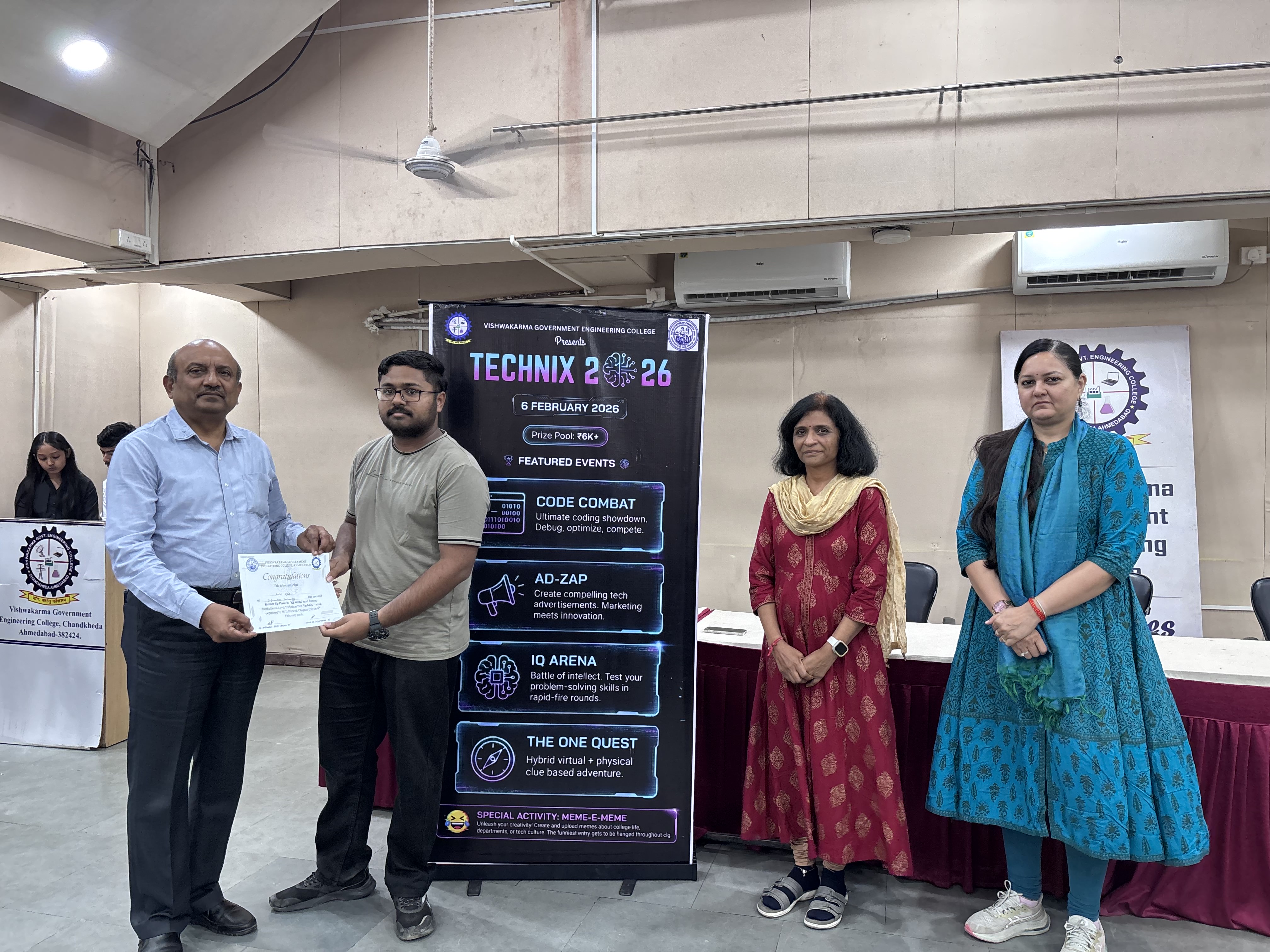 The Department of Information Technology, through the IEI Student Chapter (IT), successfully organized an institute-level technical event titled “TECHNIX 2026” on 6th February 2026 at Vishwakarma Government Engineering College, Chandkheda, Ahmedabad.